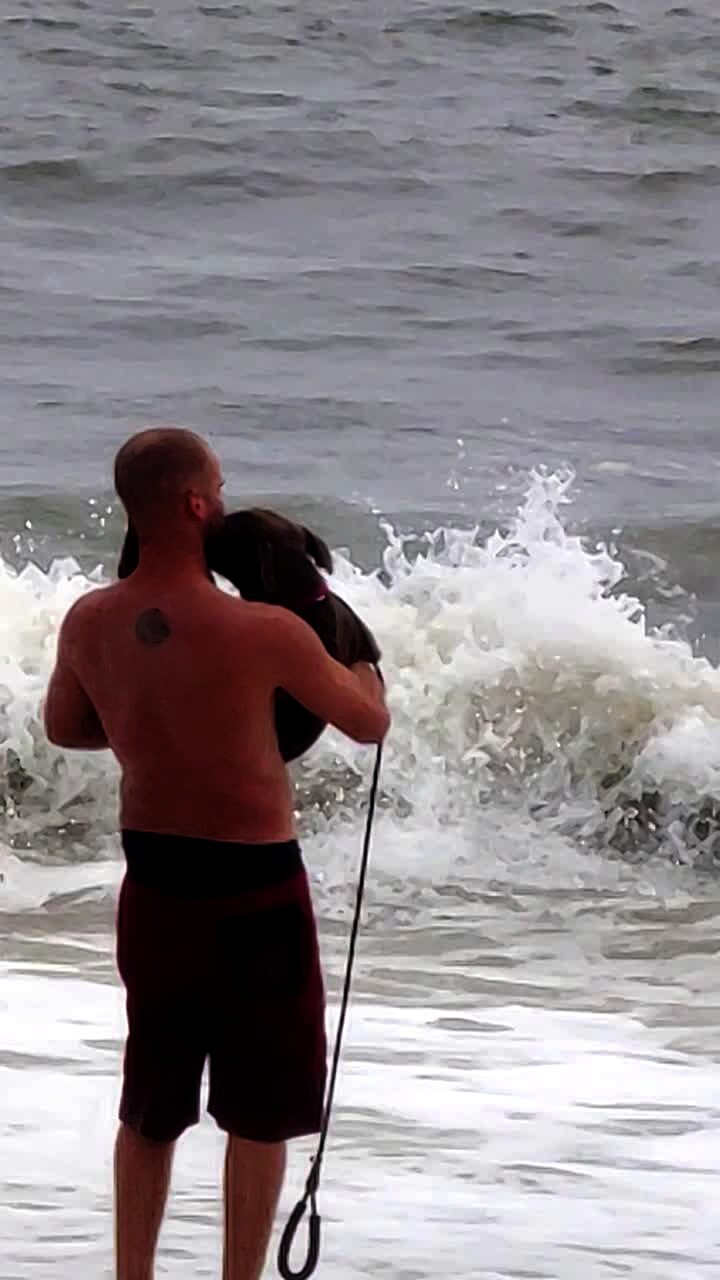 Beige dog tries to wiggle out of man's arms for a bone treat in the kitchen.