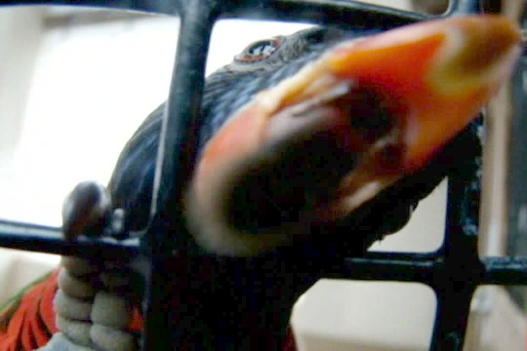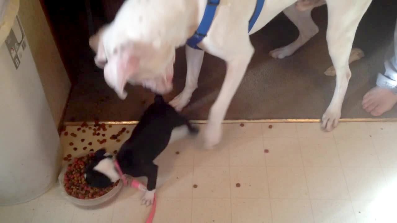 Two dogs lick and press their noses together in a living room. It's a sweet moment, until one places its paw on the other and he snaps at him with his teeth.
