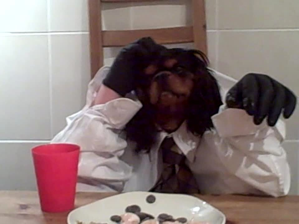 Woman sits at dining room table with her hands through a shirt and dog's head through the neckline. Looks like the Cocker Spaniel is eating with human hands. Long for edit.