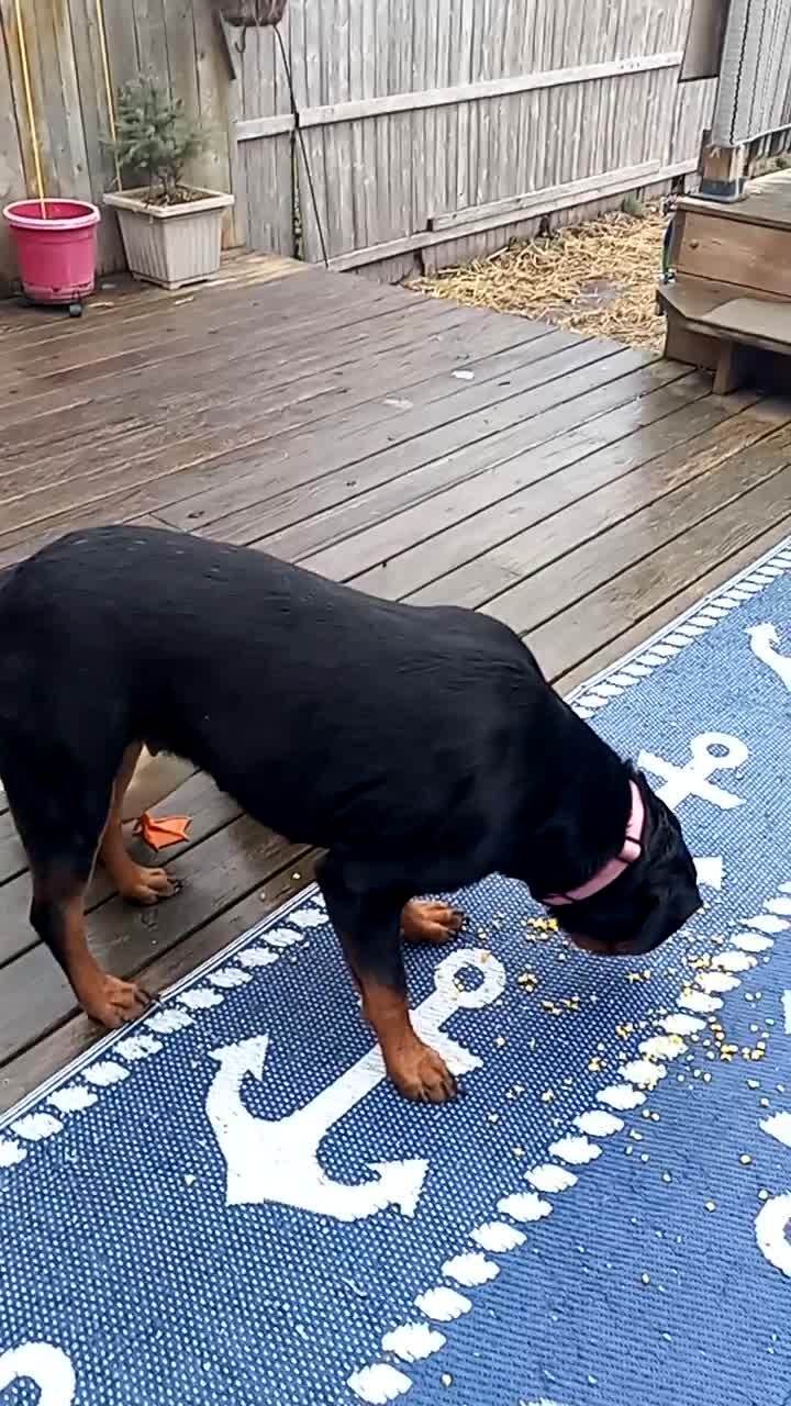 A dog on the deck eats corn on the ground and two ducks struggle to push him away.
