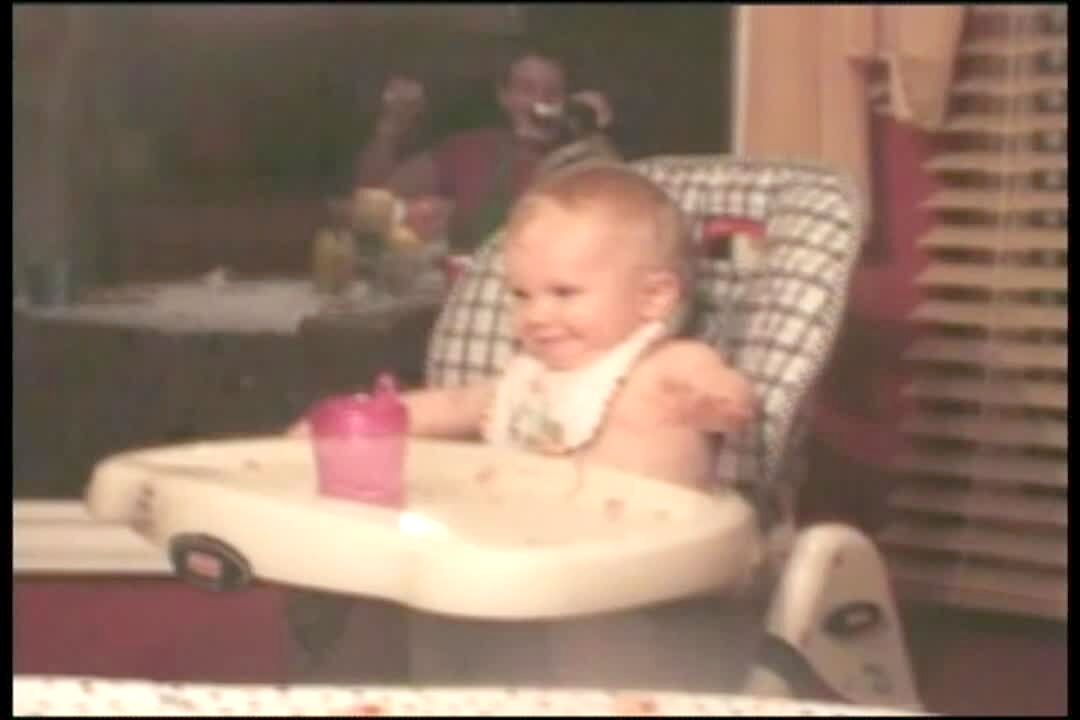 Baby boy sits quietly in high chair until mom's cell phone ringer plays. Baby dances like crazy to the ringtone. When music stops, he goes quiet again.