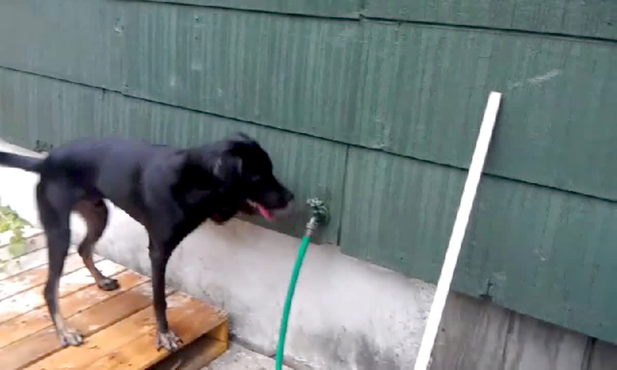 A clever dog turns on a water hose so it can bite the water that sprays out.