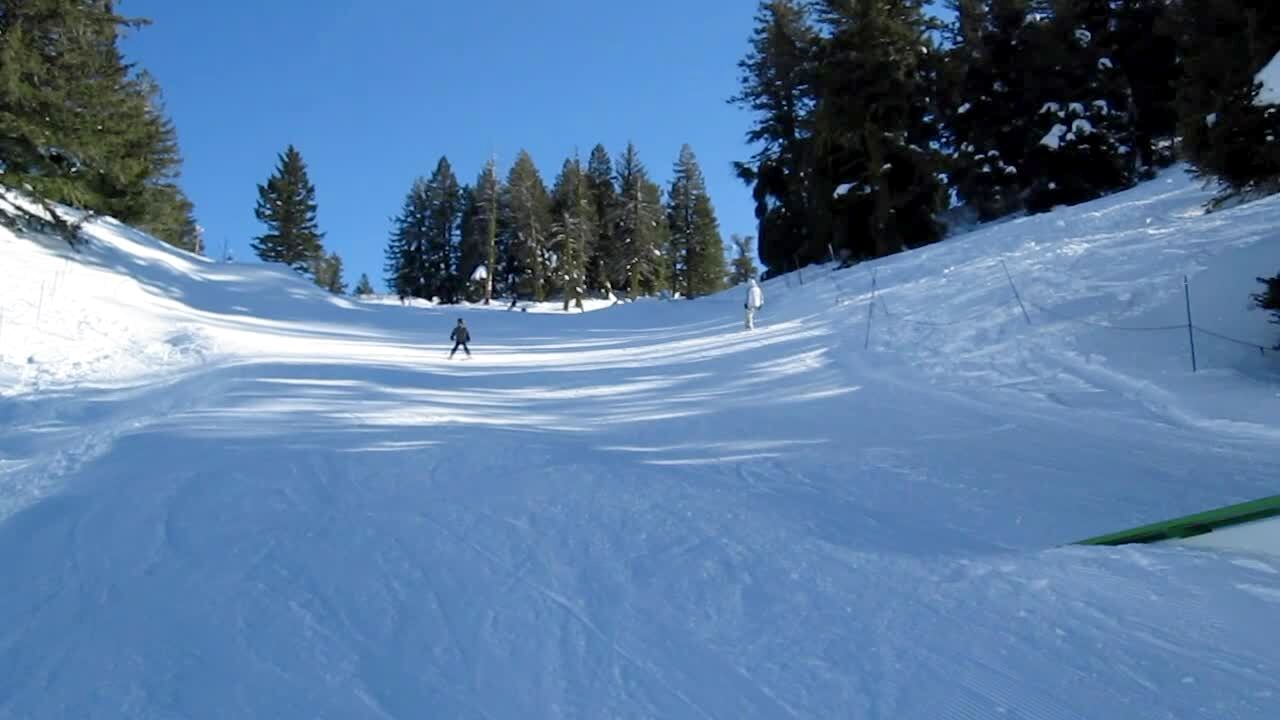 Boy skis down a hill, he tries to go over the half pipe and hits his crotch. He drags his groin across the pipe until he crashes at the bottom. Snow, winter, skiing.