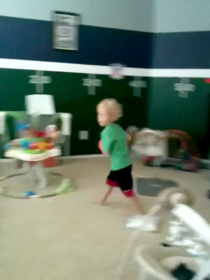A tot boy runs around a living room and dunks a toy basketball into a toy basketball hoop. He runs away from the hoop, it topples, and falls down on top of the boy, trapping him in the rim and basket. Caucasian.