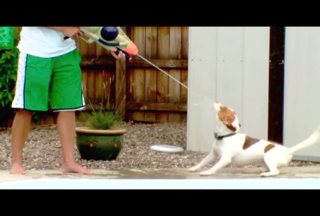 Teen girl shoots Beagle dog in the face with a water gun, dog bites at the water and likes it. Dog waits to be hit again.