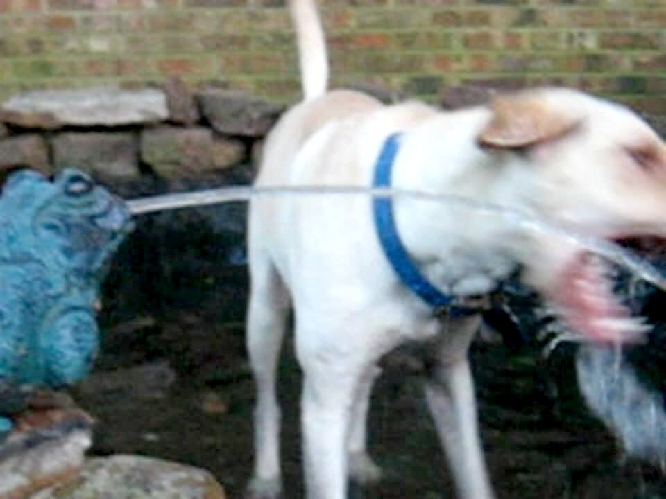 Dog stands in a rock pond and drinks the water out of a frog statue fountain's mouth