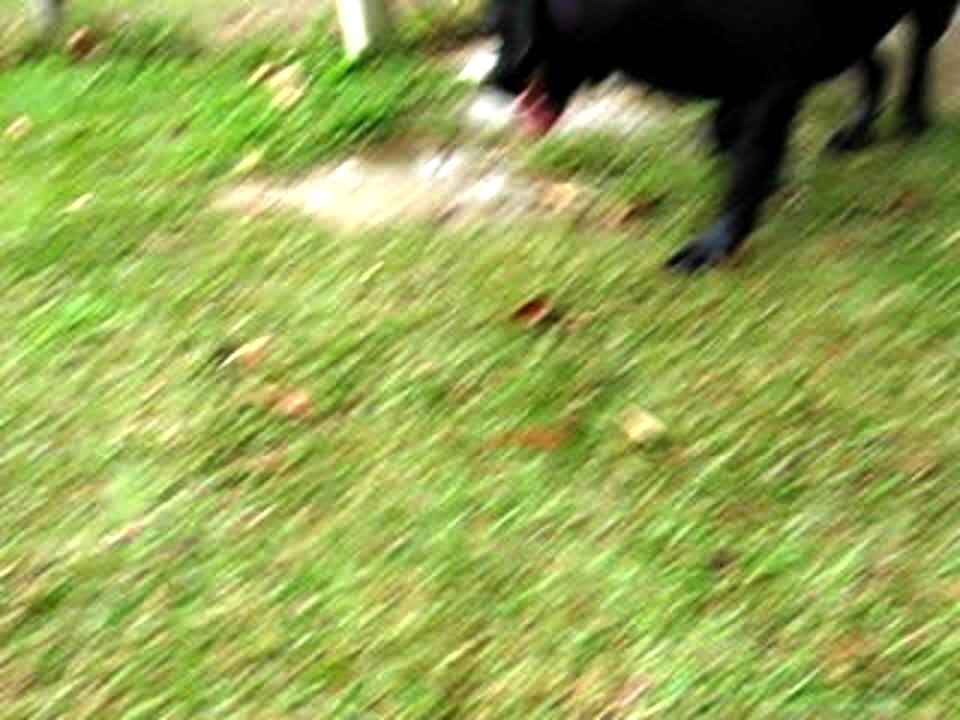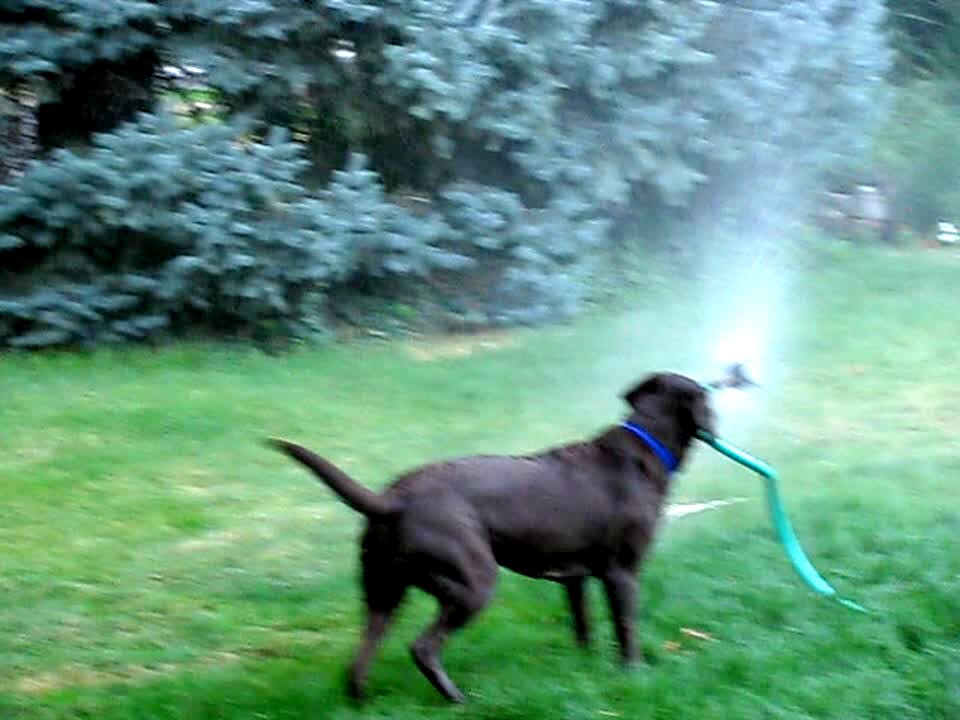 Black labrador dog plays with hose in yard. Chases man around yard with hose, getting him wet.