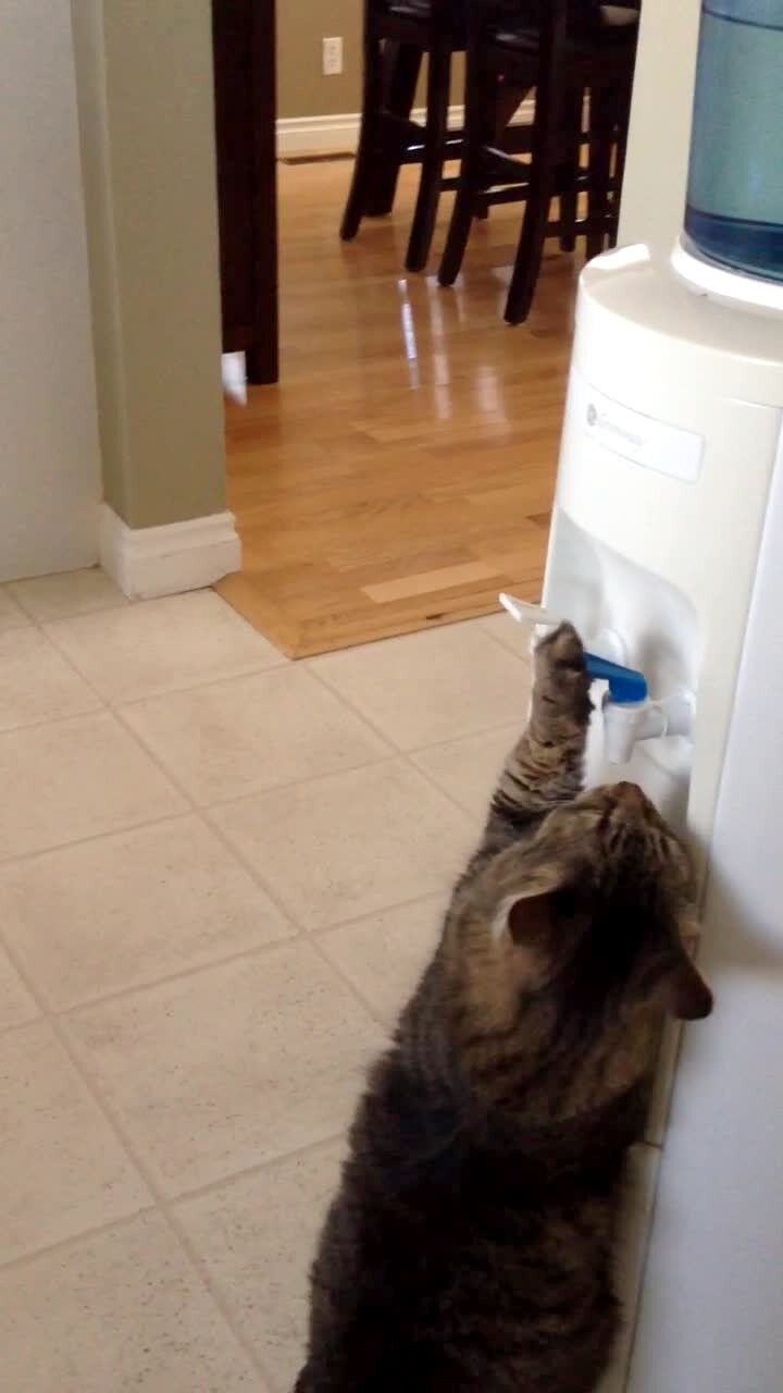 A grey cat paws at the handle of a water cooler to drink from the dispensing spout.