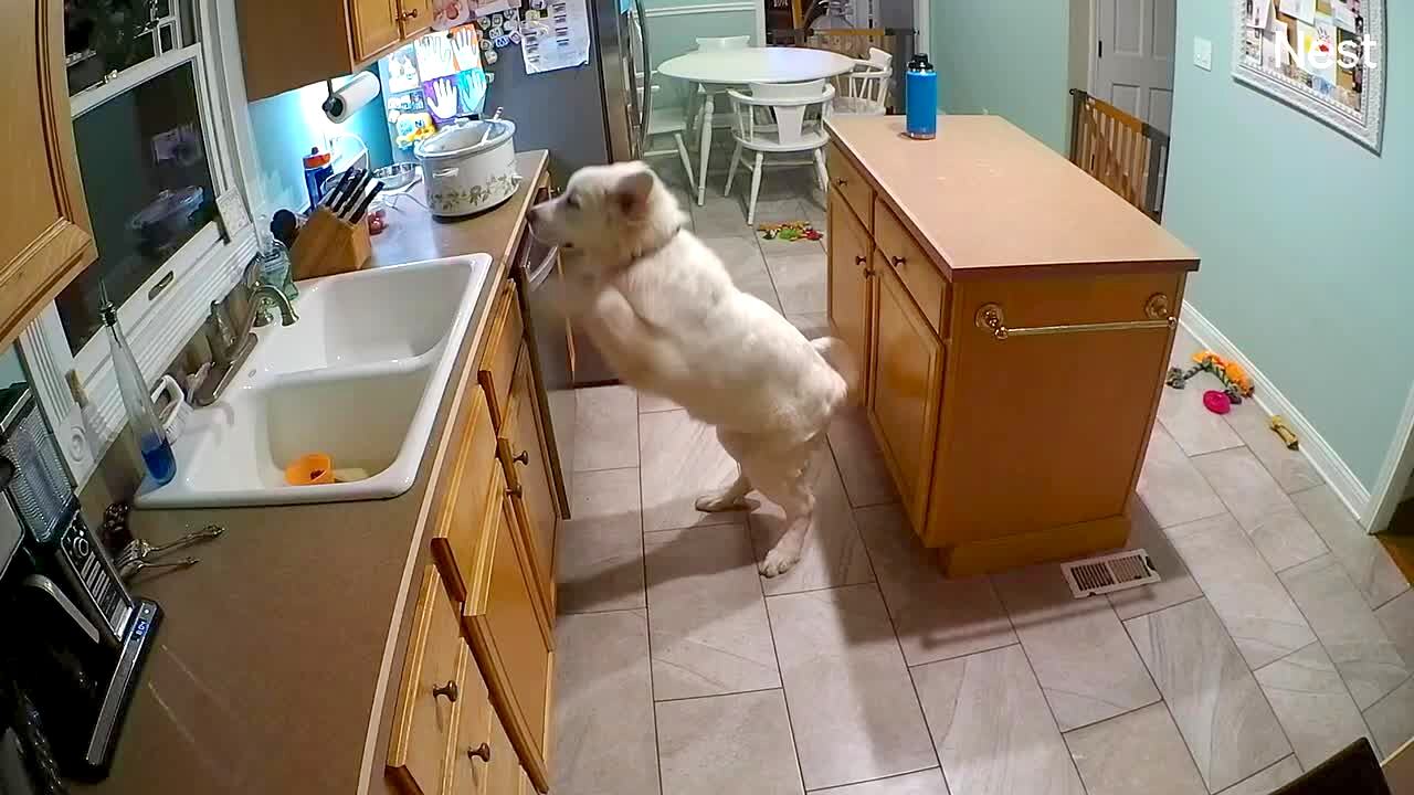 A large white dog jumps up onto a kitchen counter and helps himself to a crockpot of food when the pot then slides and falls off of the counter as the dog runs off. Security footage. No audio.