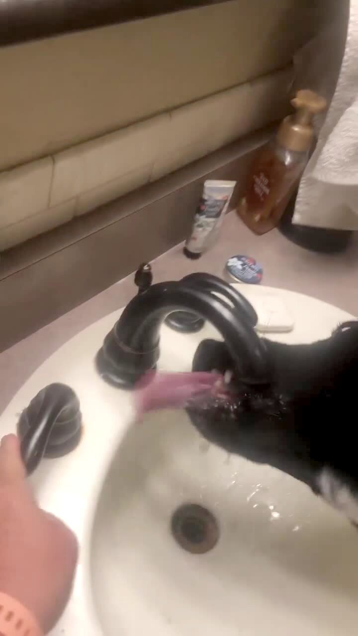 A shepherd dog uses his nose to turn on the bathroom faucet whenever a woman turns it off as he tries to drink out of it. The woman uses her hand to hold the faucet handle in place and he paws it away.