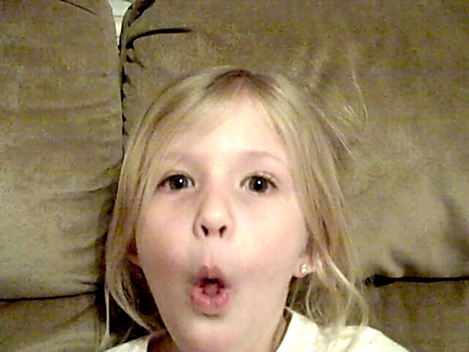 Young girl sits on a living room couch, rolls her tongue, breathes in quickly, and her lips and cheeks flutter. Funny face.