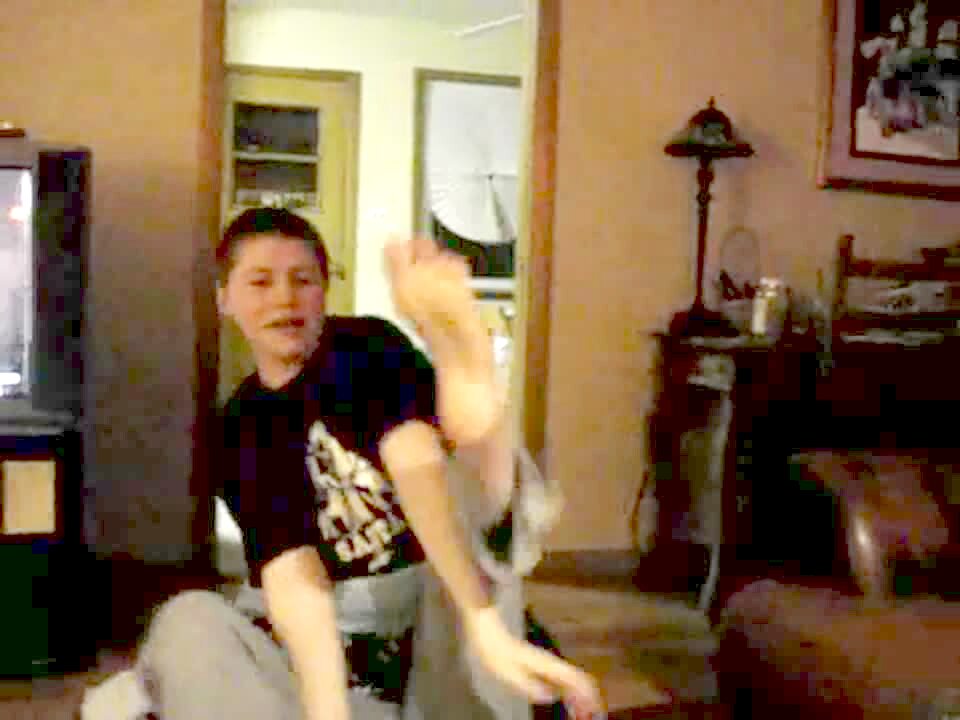 A young girl dances in the living room. Her brother suddenly falls off a couch and kicks her in the face and they both fall. Music rights not cleared.