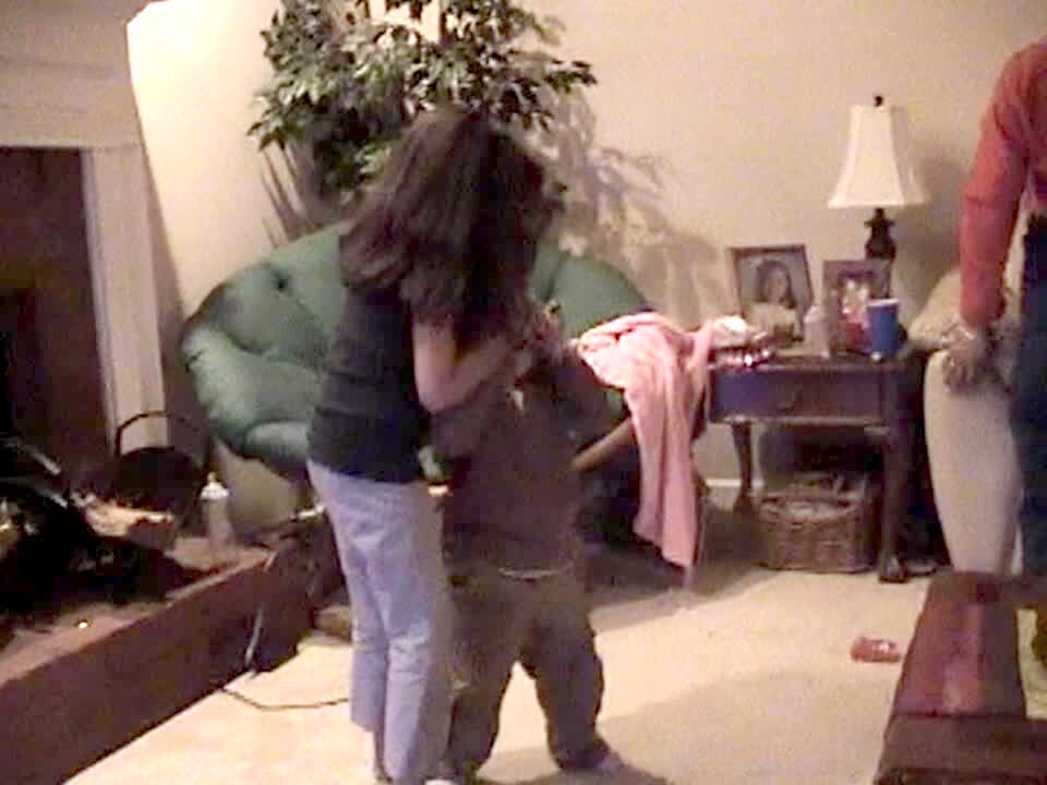 A young boy and girl dance along with a song. The boy lifts his sister on his shoulder and drops her on the floor. Music rights not cleared.