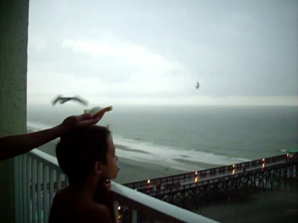 Woman and boy feed seagulls from a balcony. They scream when lightning strikes