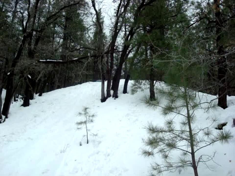 Two men are sledding down a snowy hill when they go over a jump. They fly into a tree branch and crash and fall.