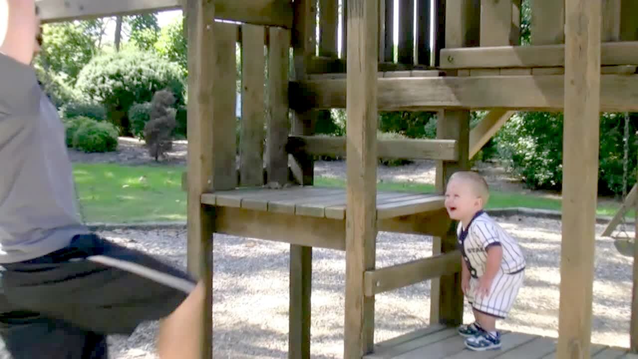 Tot boy laughs at dad climbing on monkey bars at playground, falls off platform he's laughing so hard.