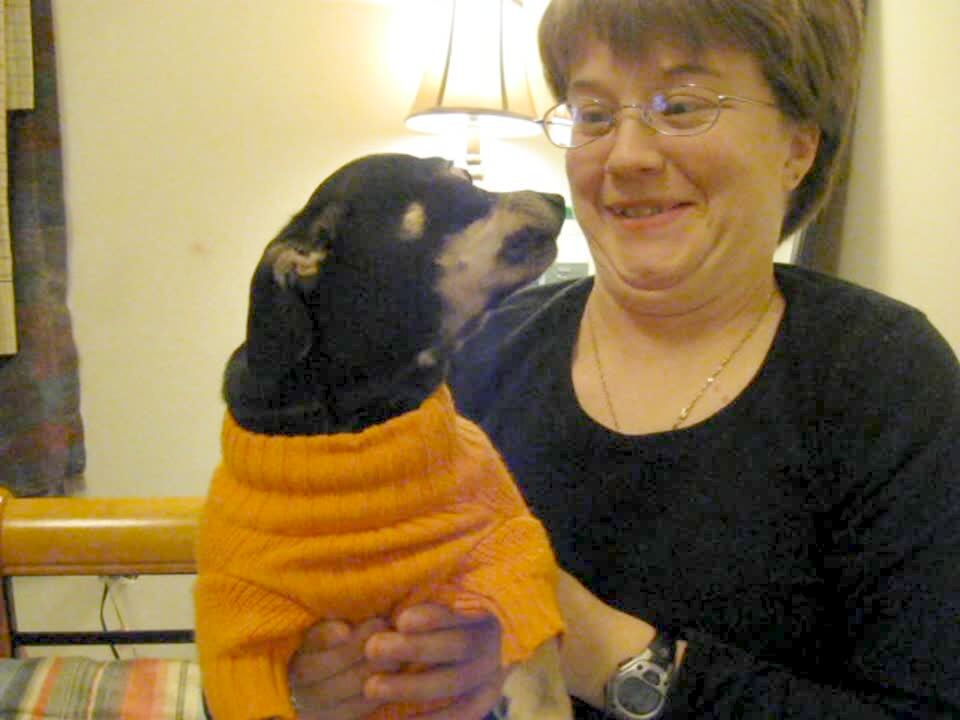 Brown lab barks at a fake alligator head as teen girls hold it up in the den. Pug dog watches.