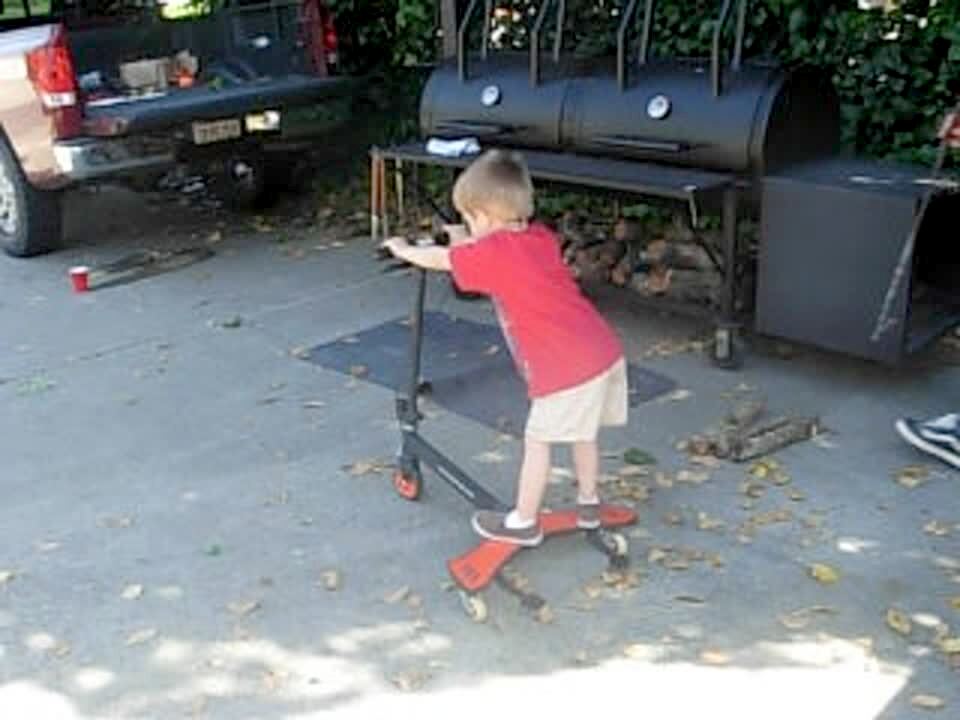 Boy stands in front of glass at zoo with his back to lion, she stalks and charges up to the glass swatting at the boy. When boy turns around he's scared by the lion & jumps back.