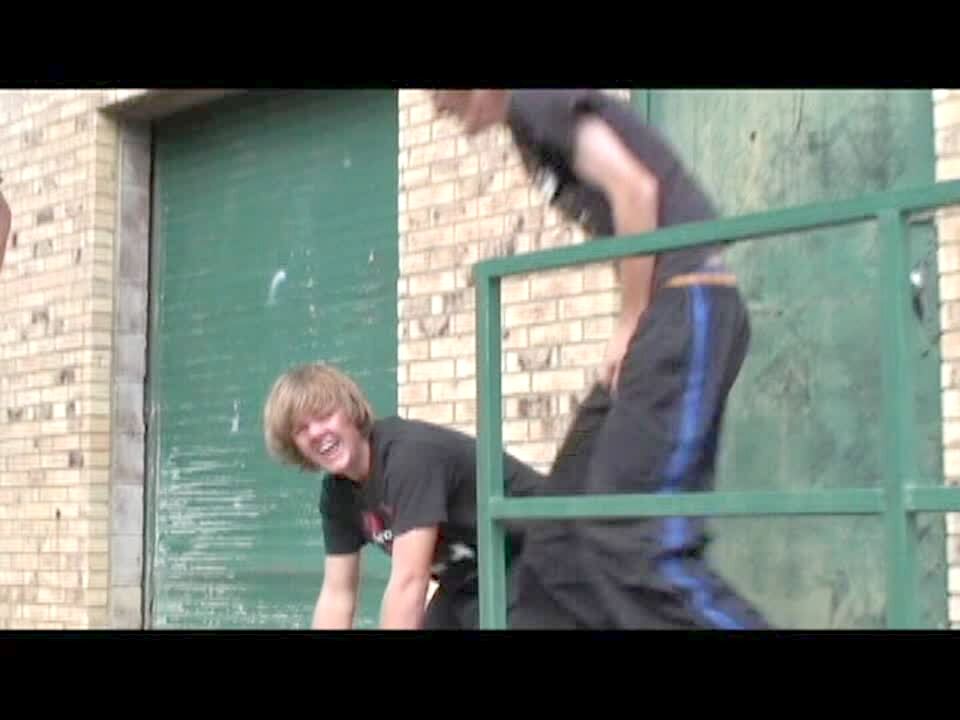 Teen boy tries to jump over a green metal fence. He flips and hits his groin on the fence. With recovery.