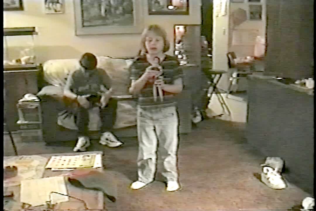 A young boy hits himself in the groin when he tries to break free from his duct taped hands.
