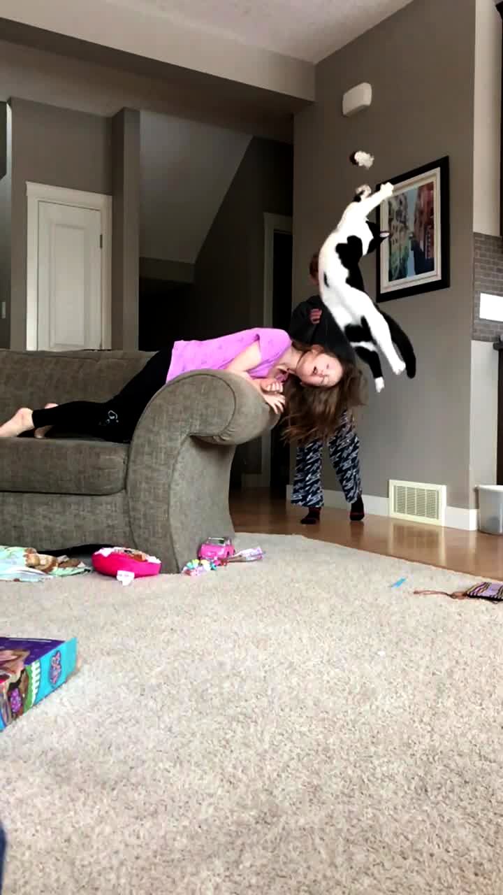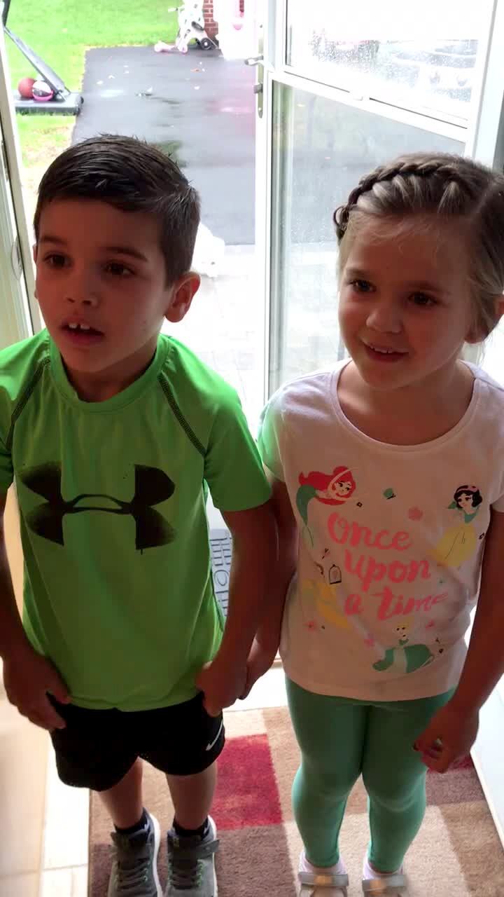 Two young girls cover their young brother in a slime bubble in the living room after they stretch it out in the air above him.