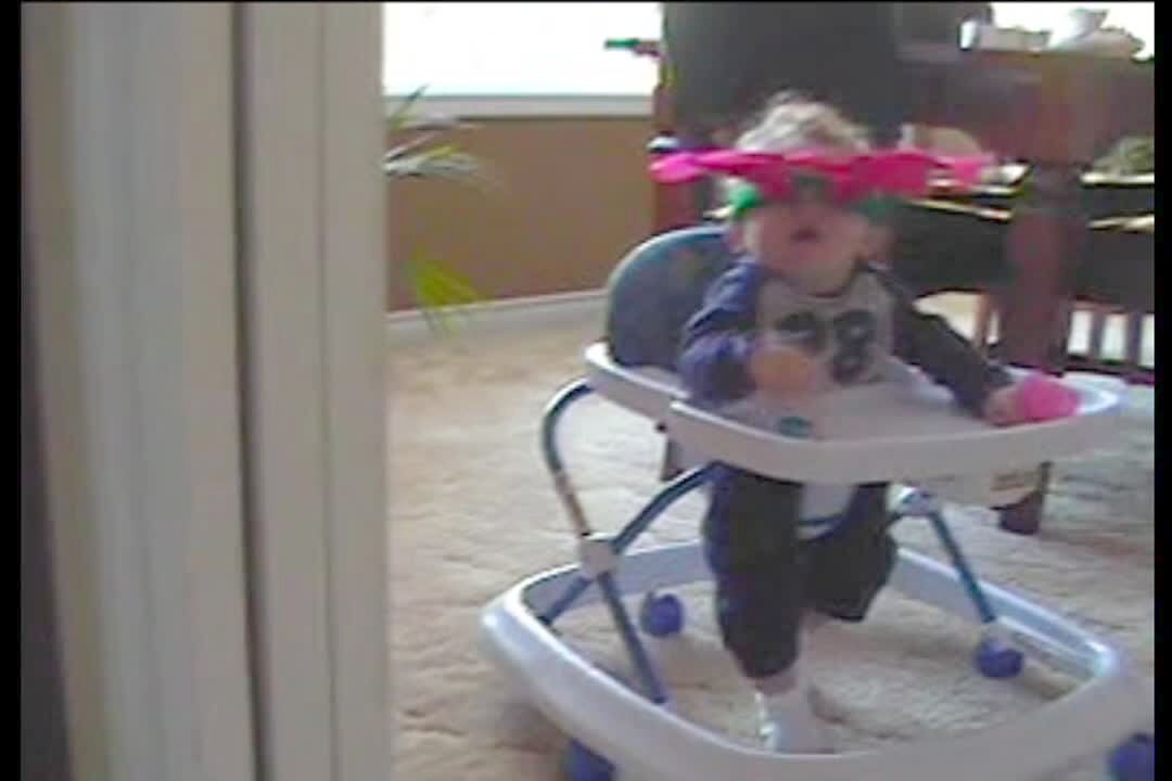 Tot boy runs through a dining room set up for his 3rd birthday party carrying a toy plastic sword. He hits a woman who has just arrived in the head with his toy sword.
