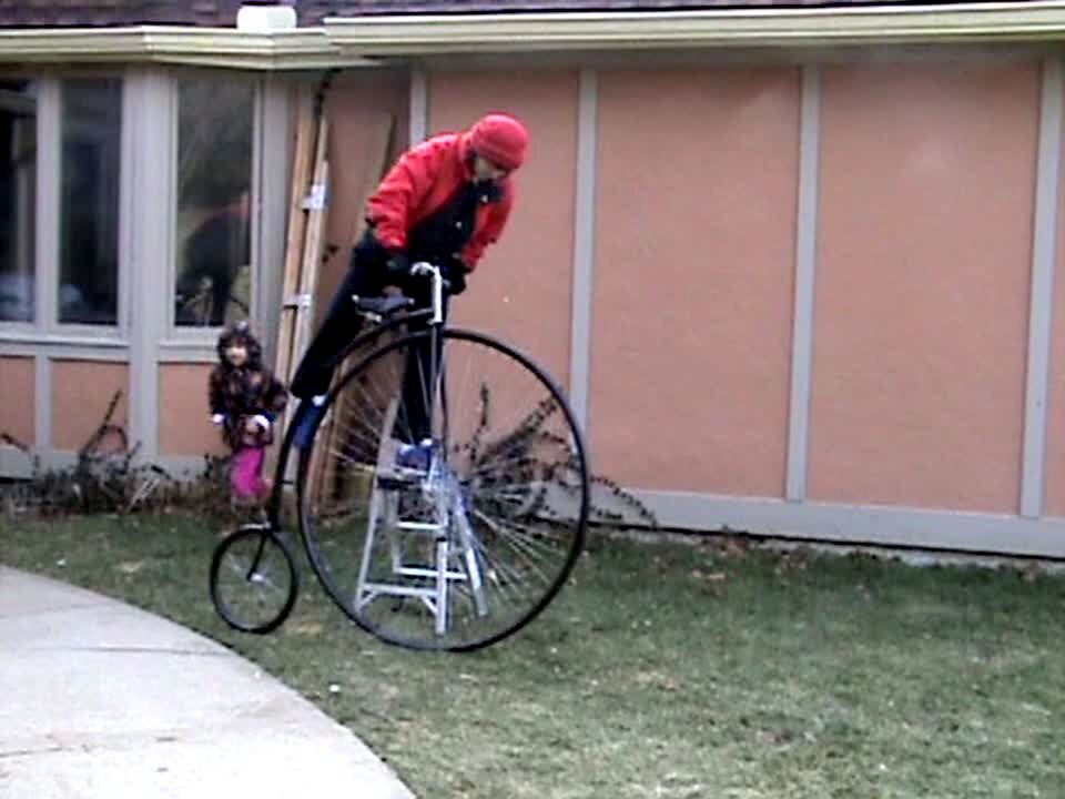 Woman tries to ride an old fashioned bicycle with the really big front wheel in front and the small wheel in back. She falls face first onto the ground. Short tails.