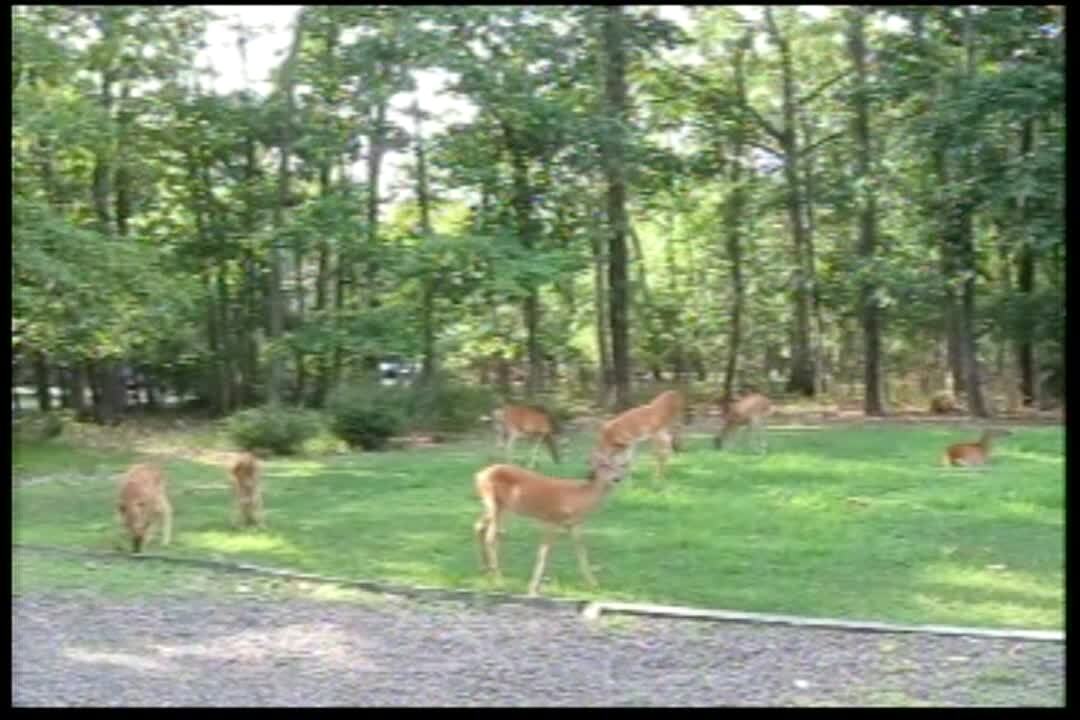 Deer eat grass in someone's front yard. Suddenly the sprinklers go on, the deer run away from the water. Surprise.