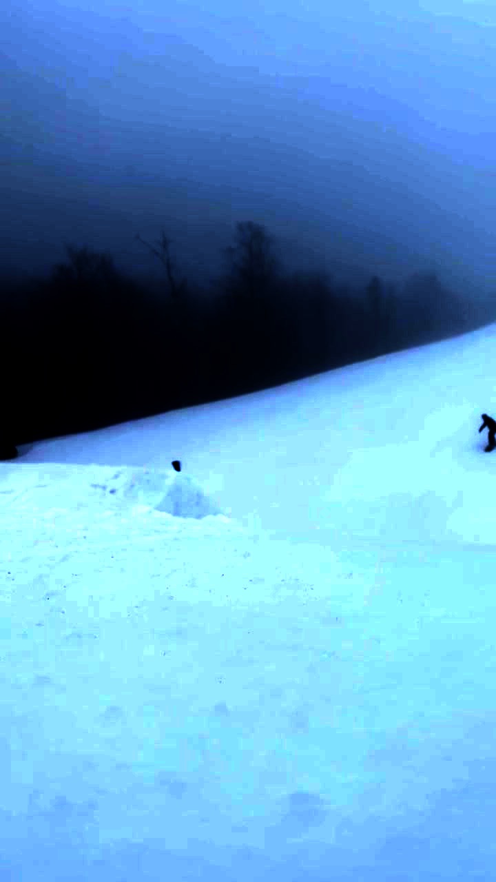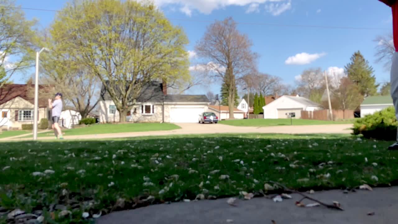 A woman says "get out of there" in a yard through a security camera, then a raccoon pops its head up from inside a trash can and leaves. Security footage.