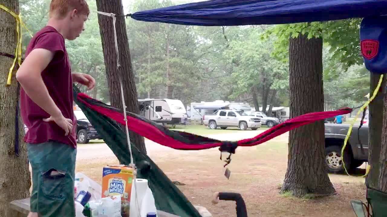 A woman falls in a hotel room when a cooler tips over while she dances on it.