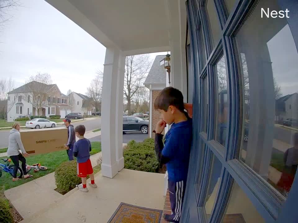A man and woman carry a large box across their front yard, but the woman trips over a bicycle and drops her end. Security footage.