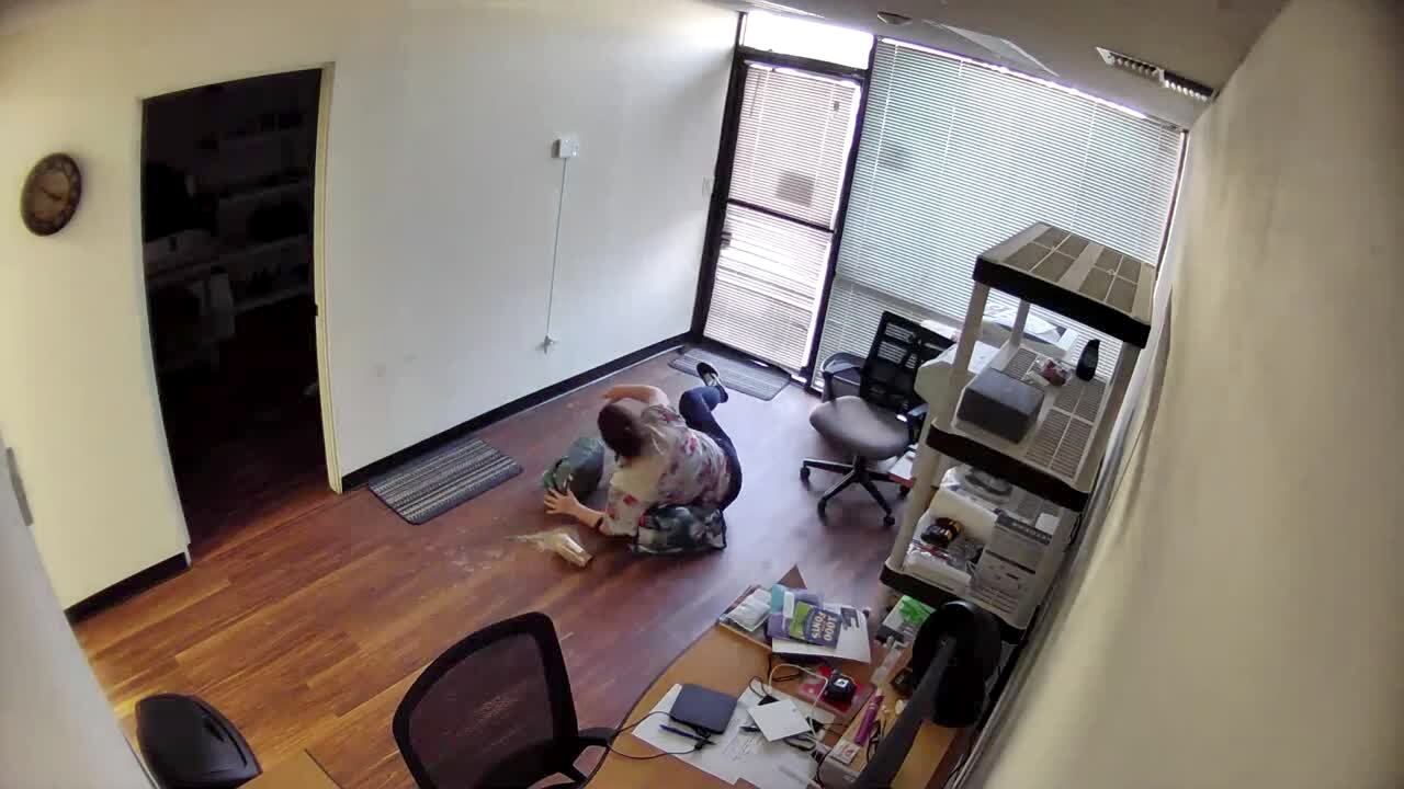 A woman walks into a room and her foot gets caught in the blinds and she trips and falls and spills her coffee. Security footage.