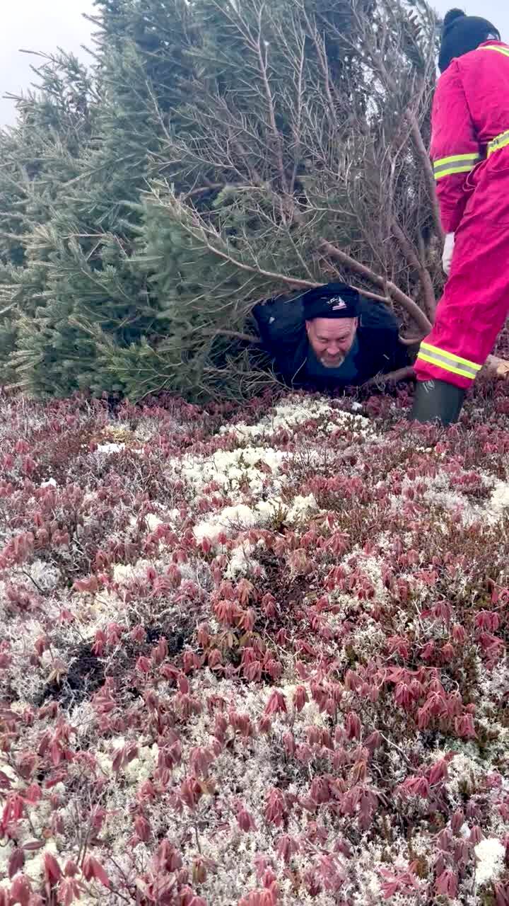 Two men try to move a large pine tree when one of them gets pinned under the trunk..