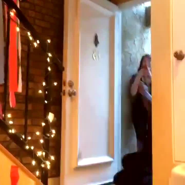 A man opens the front door of a house and gets shocked by a surprise party and he freaks out and falls down.