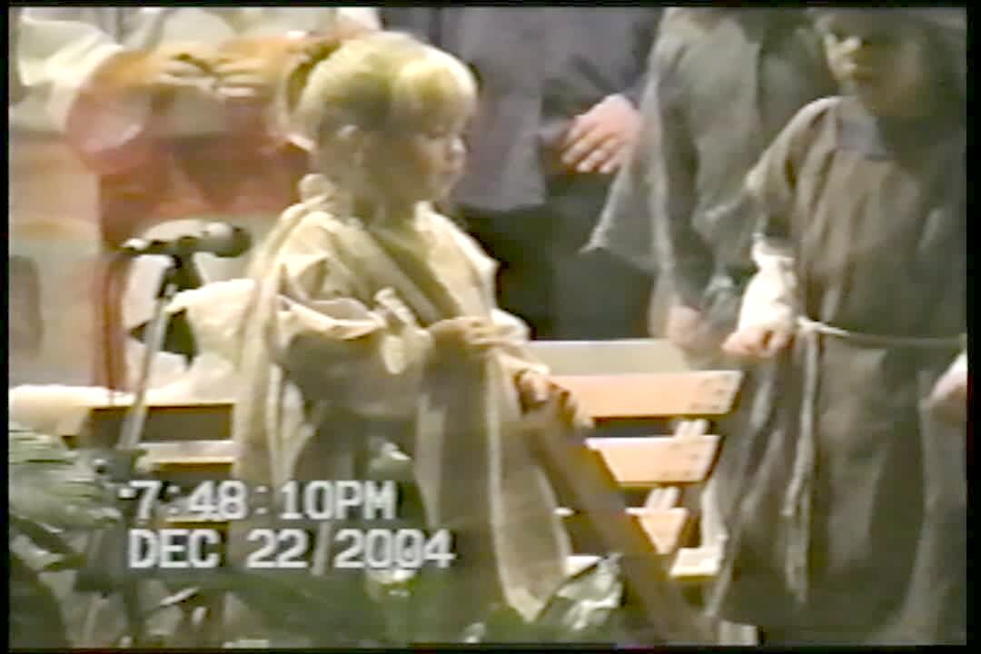 Christmas show at Baptist church. Nativity scene. Everyone on stage is singing Happy Birthday Jesus and little girl comes from audience and steals the baby Jesus doll from manger. Another tot takes the doll back and puts it in the manger.