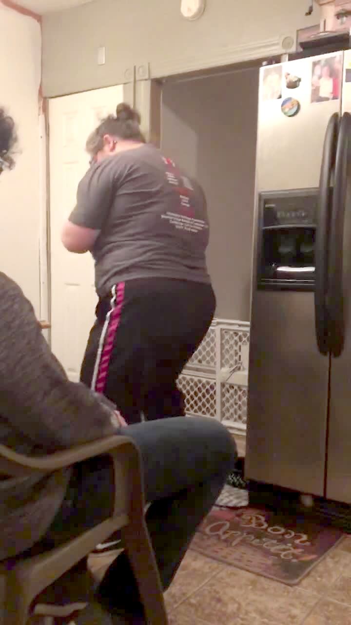 A woman dances to Beyonce in the kitchen, and falls backwards as she knocks over a fence.