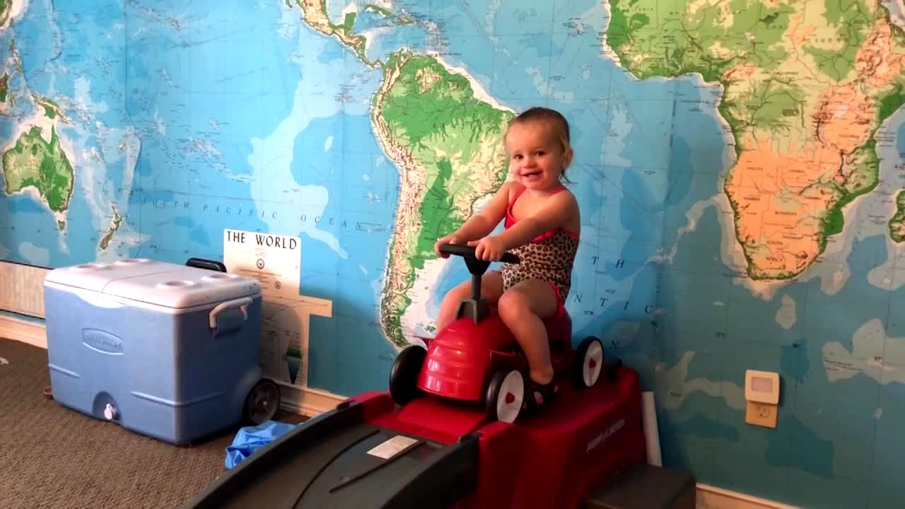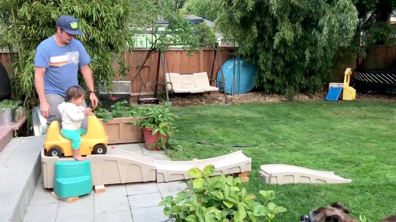 A tot girl rides a roller coaster slide in the backyard, launches off the end and falls as the car she was on lands on top of her.