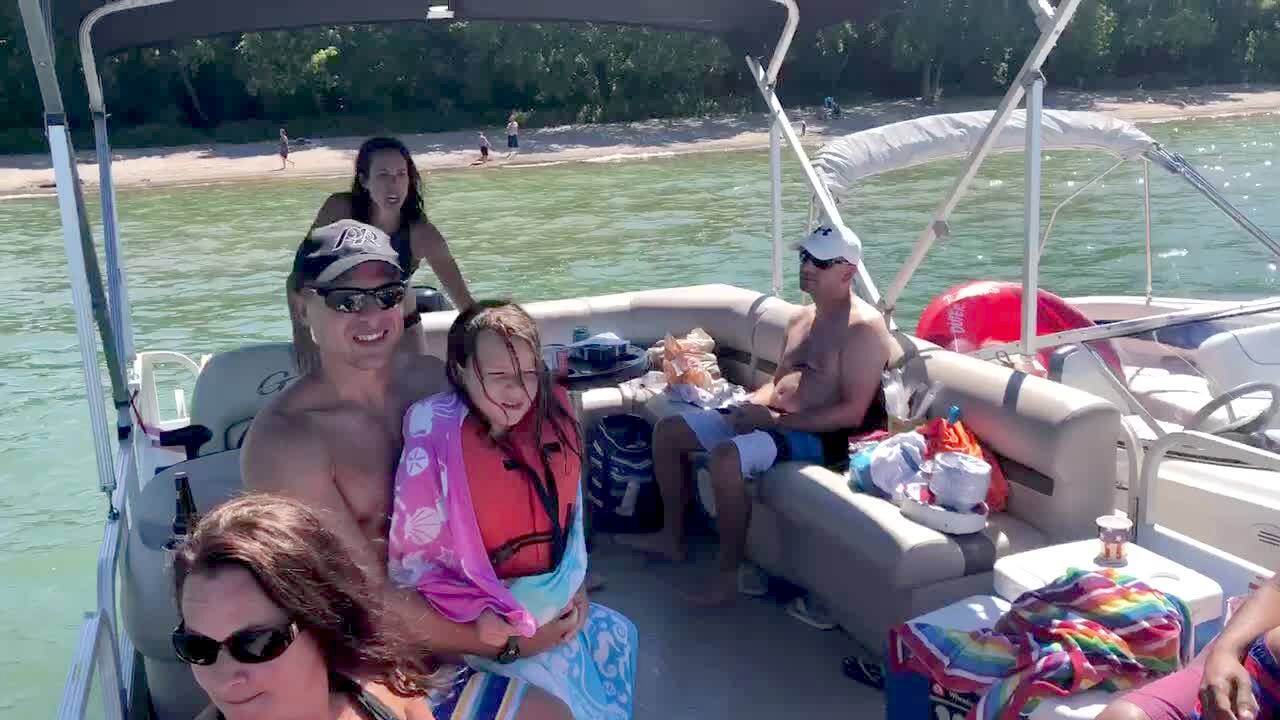A woman falls on to an inflatable pool float lounge pad on a lake when she trips over the side of a boat as she runs on it to do a back handspring off of the float in to the water.