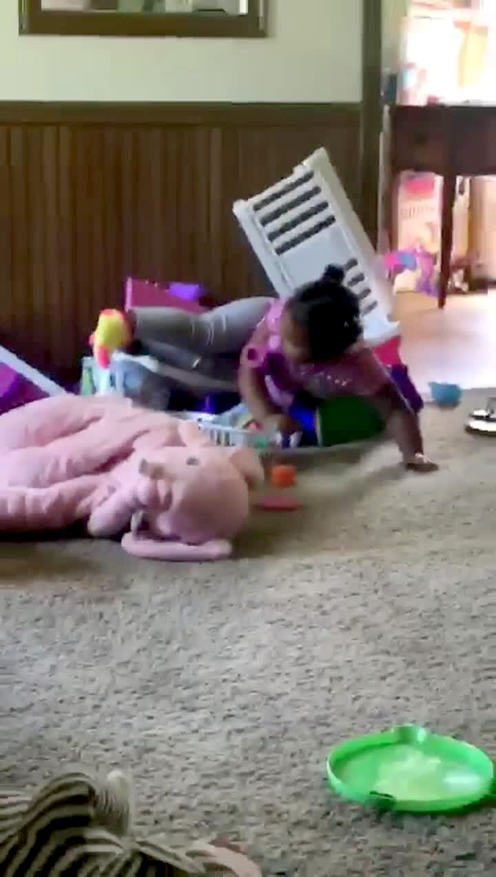 A toy basketball hoop falls on a tot boy when he dunks a ball into it in the living room.