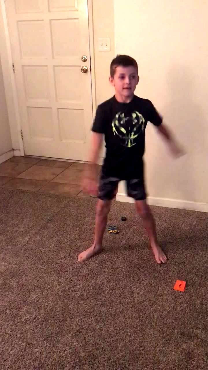 A tot boy waves his arms from side to side before he falls on the living room floor as he attempts to copy a young boy while he does the "floss" dance.