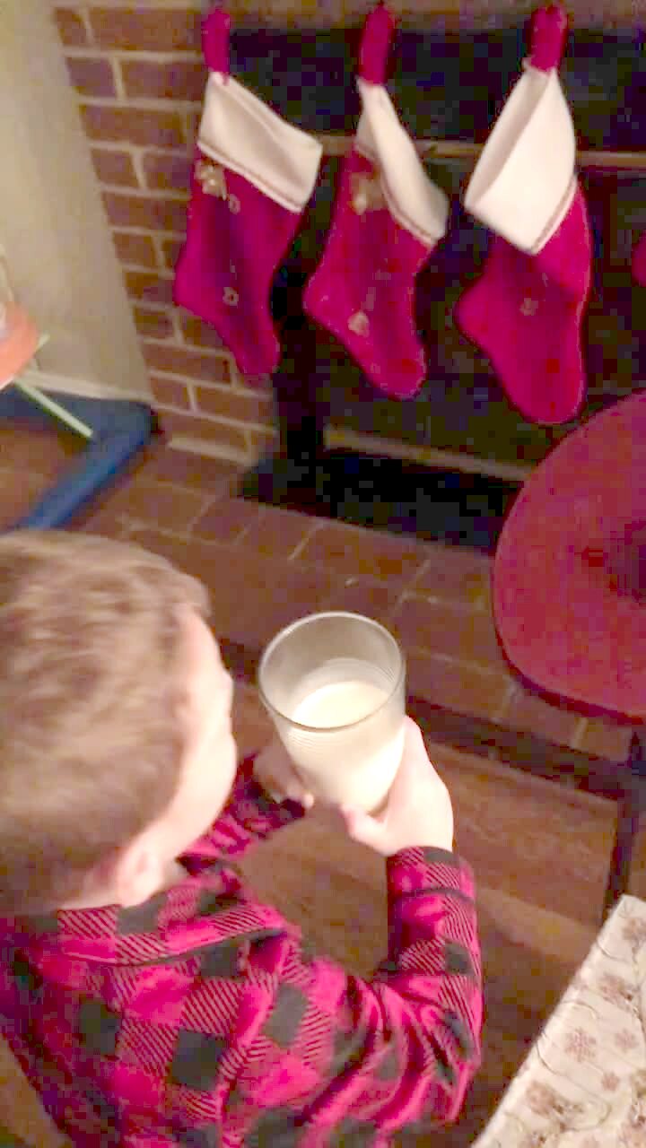 A tot boy tips over a table in the living room when he grabs it and he spills the milk he left for Santa on to himself as he falls down.