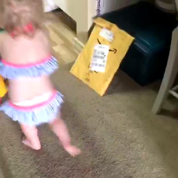 A tot boy hits his head against the patio rail and falls down when his mother bumps him with her butt while she does the "floss" dance on the patio.