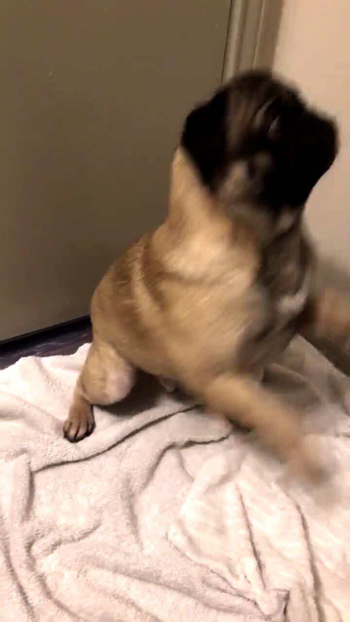 A woman tells a dog that it's under arrest and it stands on its back legs and puts its front paws against the wall.
