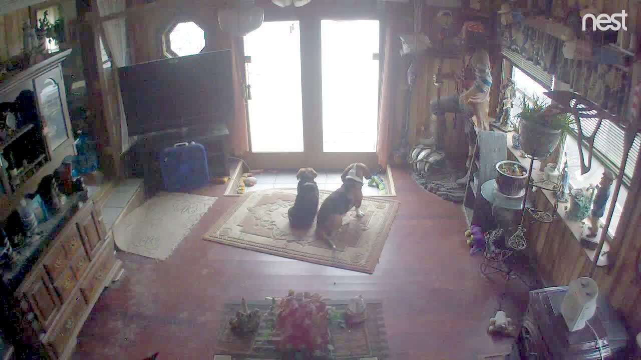Two Beagle dogs sit in the living room. One dog barks, scaring the other, who runs into a planter and knocks it over, breaking it.