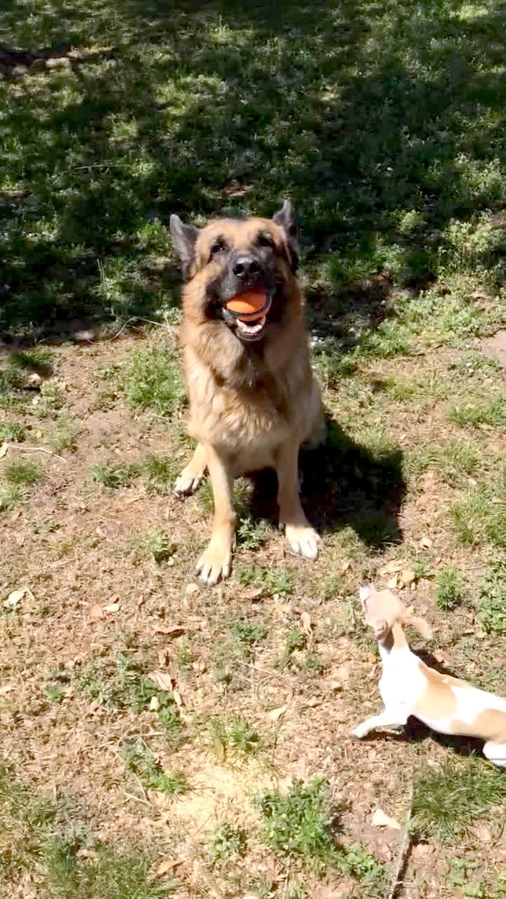 A German Shepherd dog holds a red ball in its mouth while a Chihuahua dog jumps up repeatedly trying to get to the ball outdoors.