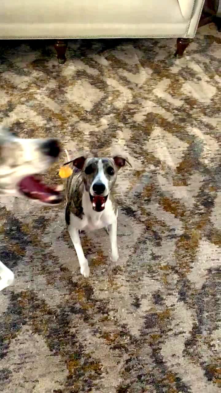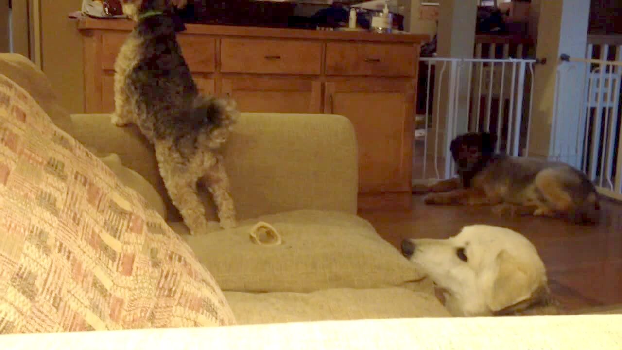 A treat bounces off a dog's mouth in slow motion, it looks around for it on the floor, then another dog takes it and runs out of the room.