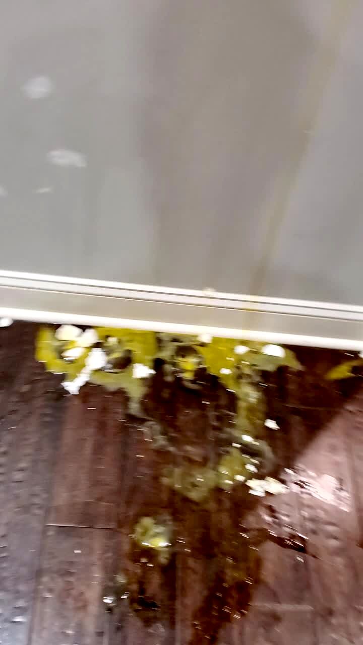 A tot boy points to a mess of cracked eggs on the kitchen floor and asks who will clean them up. The boy's mother asks who will clean the mess and he says she will.