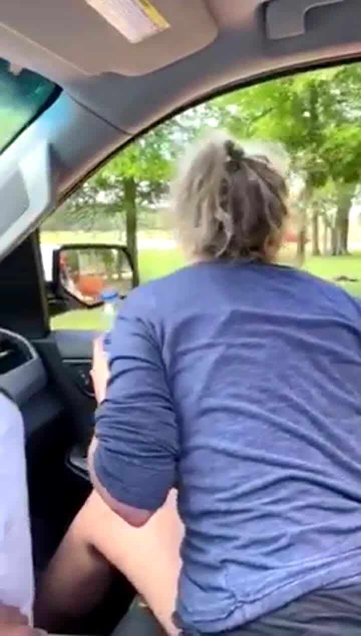 An ox spits into a woman's mouth, then she drinks water so she can gag and spit out of her car at a drive through safari park.