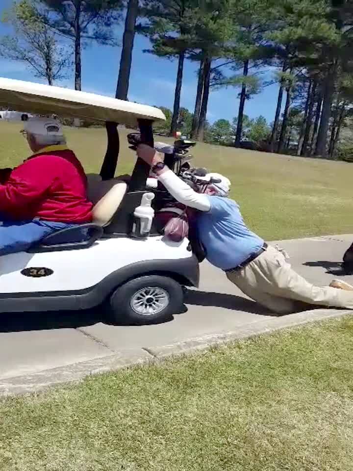 A woman pops a gender reveal balloon and gets covered in pink powder in the yard.