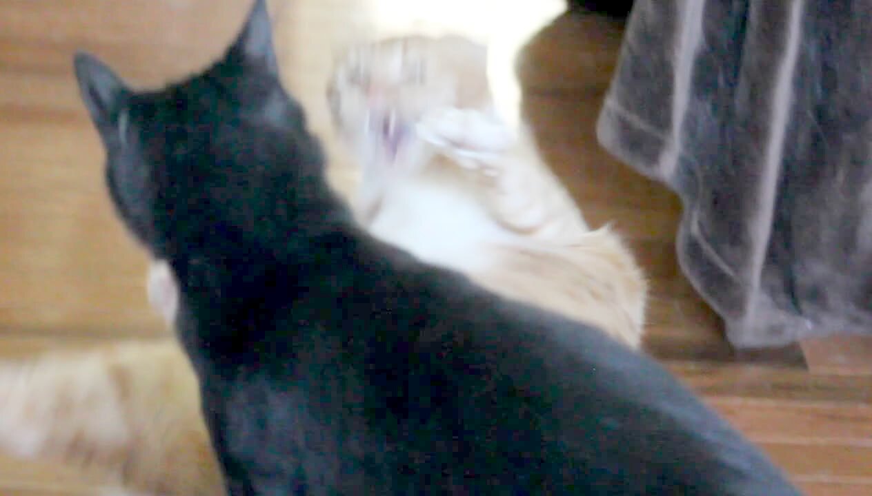 A cat tries to wrestle but is too fat to get up.